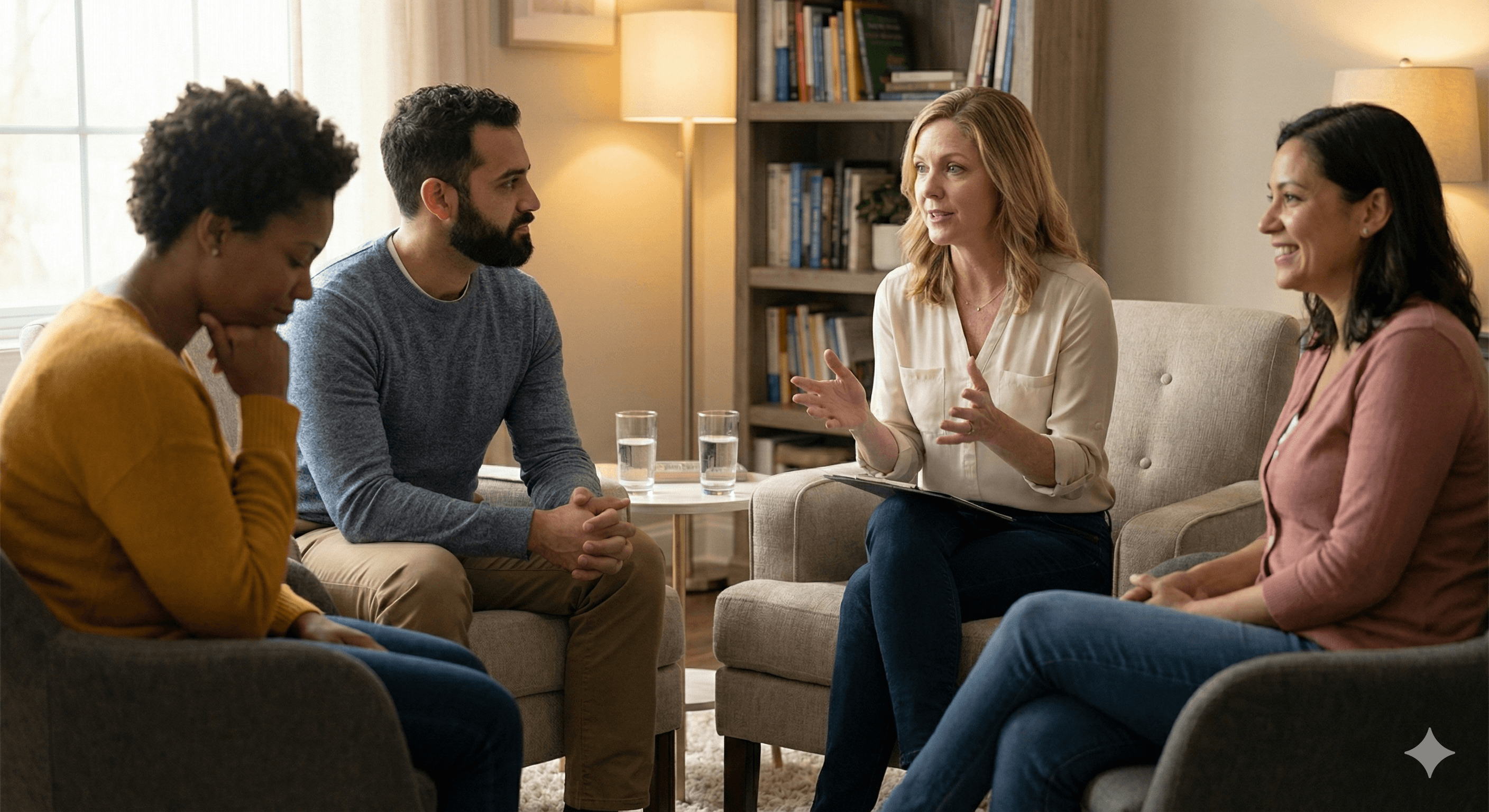 Evidence-Based Modalities: We utilize group-adapted techniques including Cognitive Behavioral Therapy (CBT), Dialectical Behavioral Therapy (DBT), Process Groups, and Psychoeducation to facilitate collective growth.
